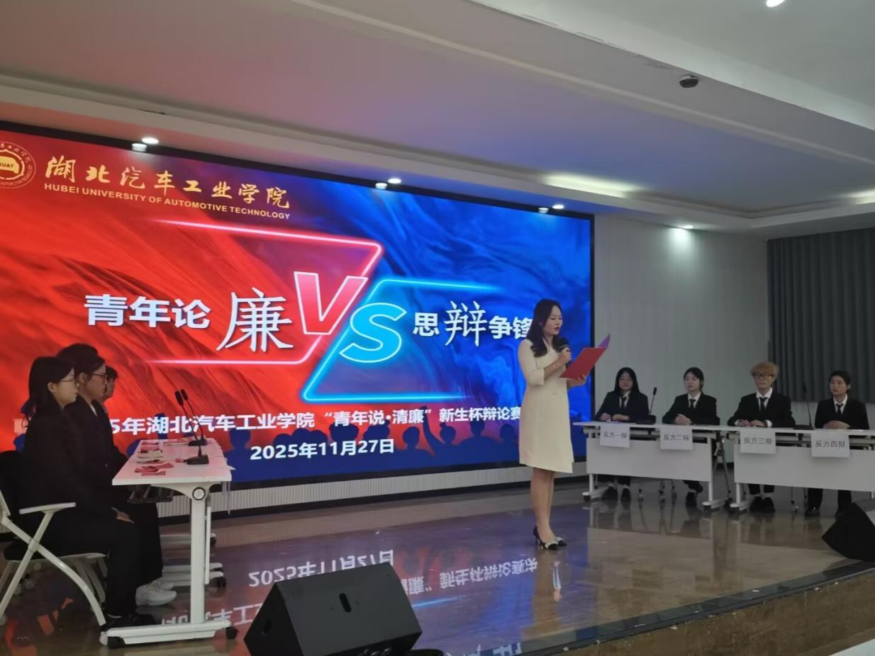 (文 曾慧琳、钱志豪、鲍洁/图 唐顺利)作为学校清廉文化月活动、校团委“汽院青年说”系列活动及清廉社团建设的品牌项目,11月27日中午,“青年说・清廉”新生杯辩论赛决赛在5101报告厅举行。本次辩论赛聚焦“文艺作品刻画清廉形象,更应突出人格魅力还是行为准则”主题,邀请湖北省朗诵艺术家协会十堰工作部主任、十堰市朗诵艺术家协会副会长成勇,汽车商学院教授姚丽萍,法学院和知识产权学院副教授陈来宏等担任评委,外语外贸学院代表队与法学、知识产权学院代表队同台竞技,呈现了一场兼具思想深度与思辨张力的精彩对决。