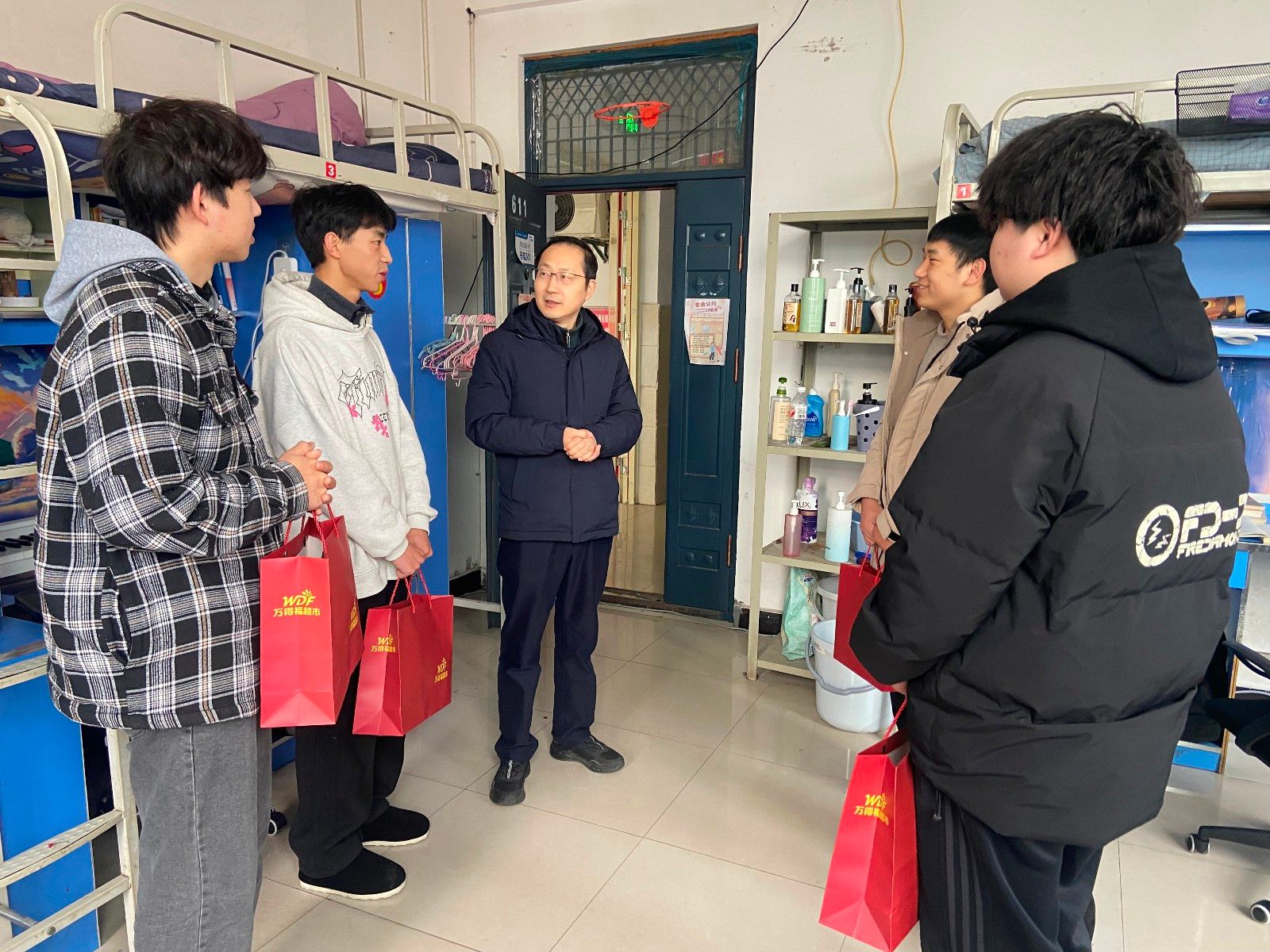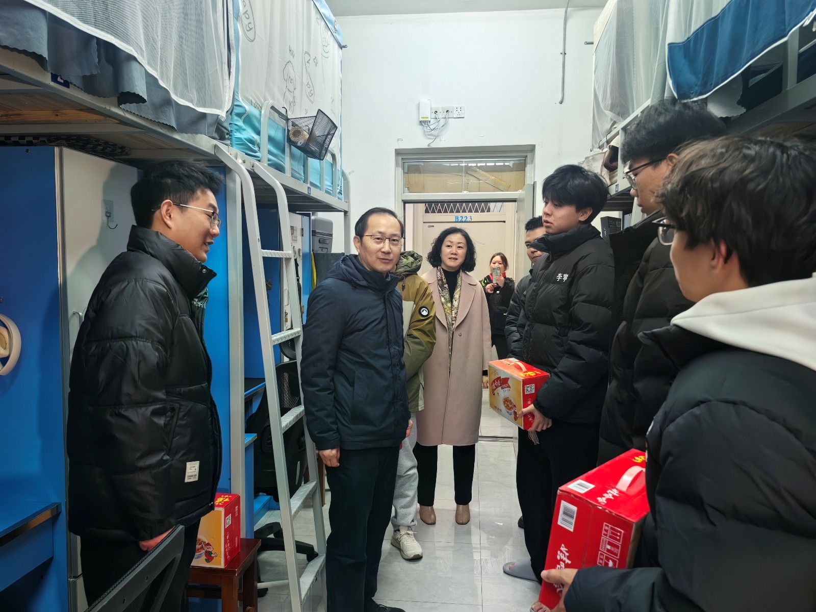 在李园学生宿舍开展的“学海领航”慰问活动中,李涛叮嘱光电工程学院、新能源学院和汽车材料学院的学生们尽快调整状态,主动抓好学业,夯实专业基础;同时要加强体育锻炼,增强身体素质;更要及早做好职业规划,明确发展方向,为未来的职业生涯打下坚实基础。