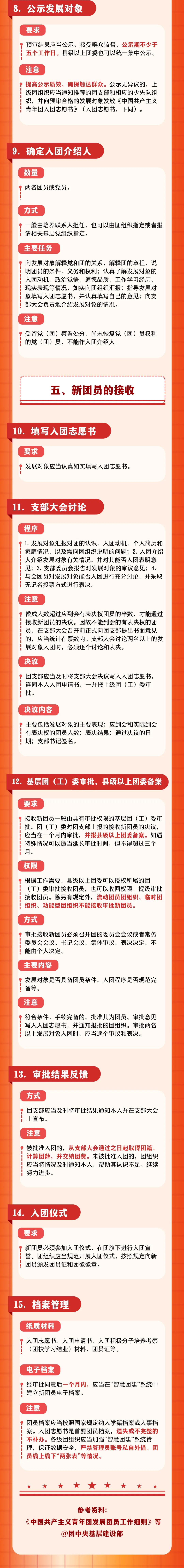 根据2023年8月共青团中央修订《中国共产主义青年团发展团员工作细则》(请点击文末阅读原文查看),发展团员分为申请入团、入团积极分子的确定、教育培养和考察、发展对象的确定、新团员的接收5个阶段15个步骤。